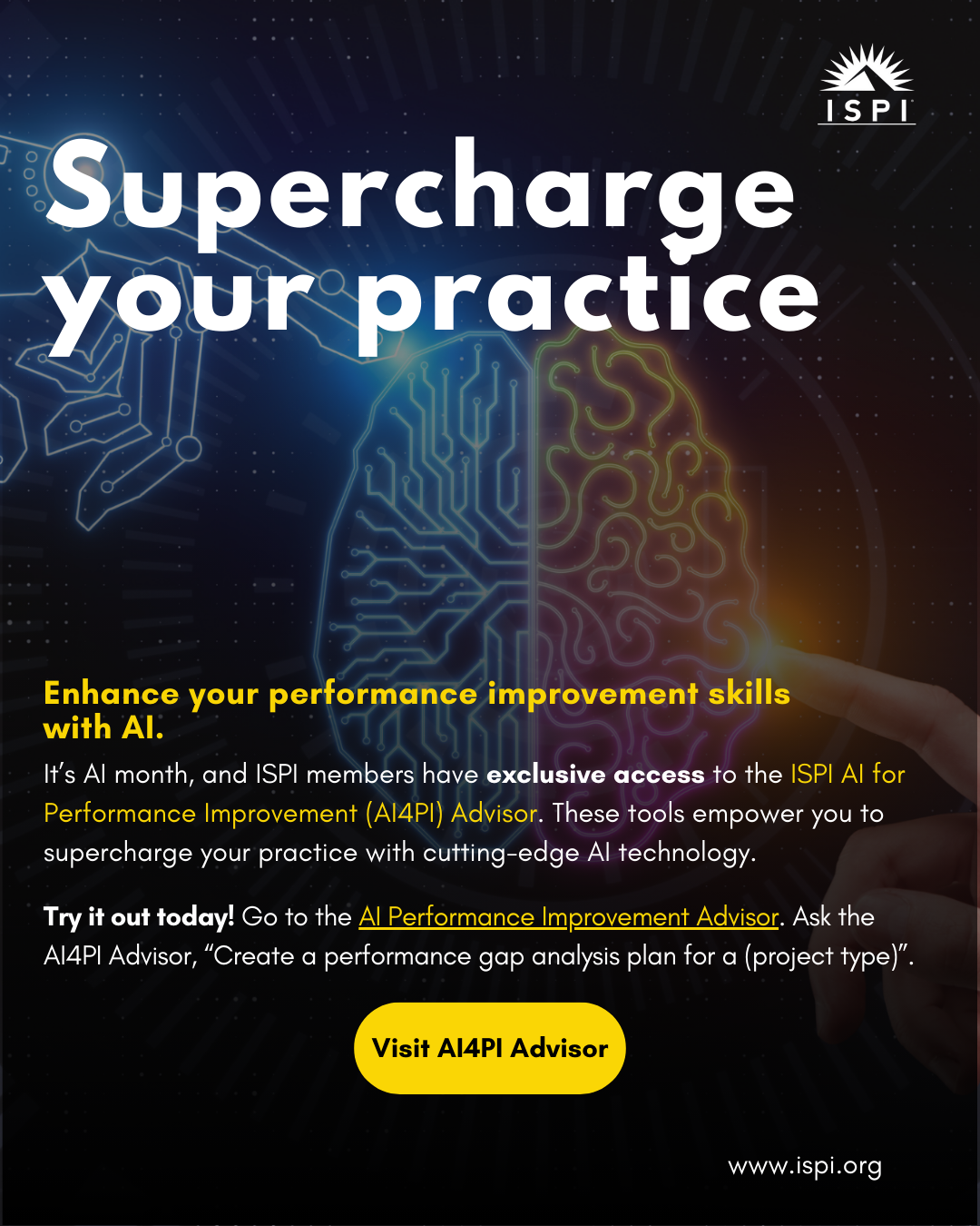 Enhance your performance improvement skills with AI. It’s AI month, and ISPI members have exclusive access to the ISPI AI for Performance Improvement (AI4PI) Advisor. The AI4PI Advisor empowers you to supercharge your practice with cutting-edge AI technology. Try it out today! Go to the AI Performance Improvement Advisor. Ask the AI4PI Advisor, “Create a performance gap analysis plan for a (project type)”. Learn more at www.ispi.international/ai4pi